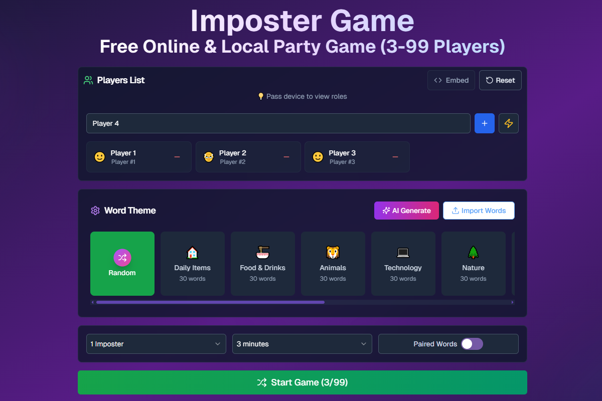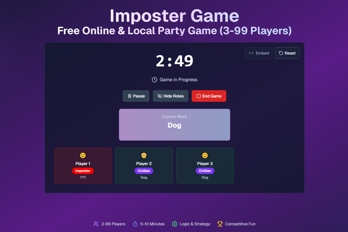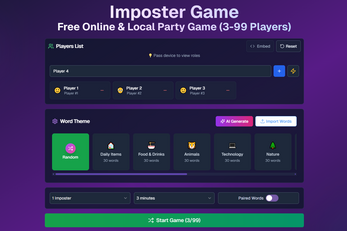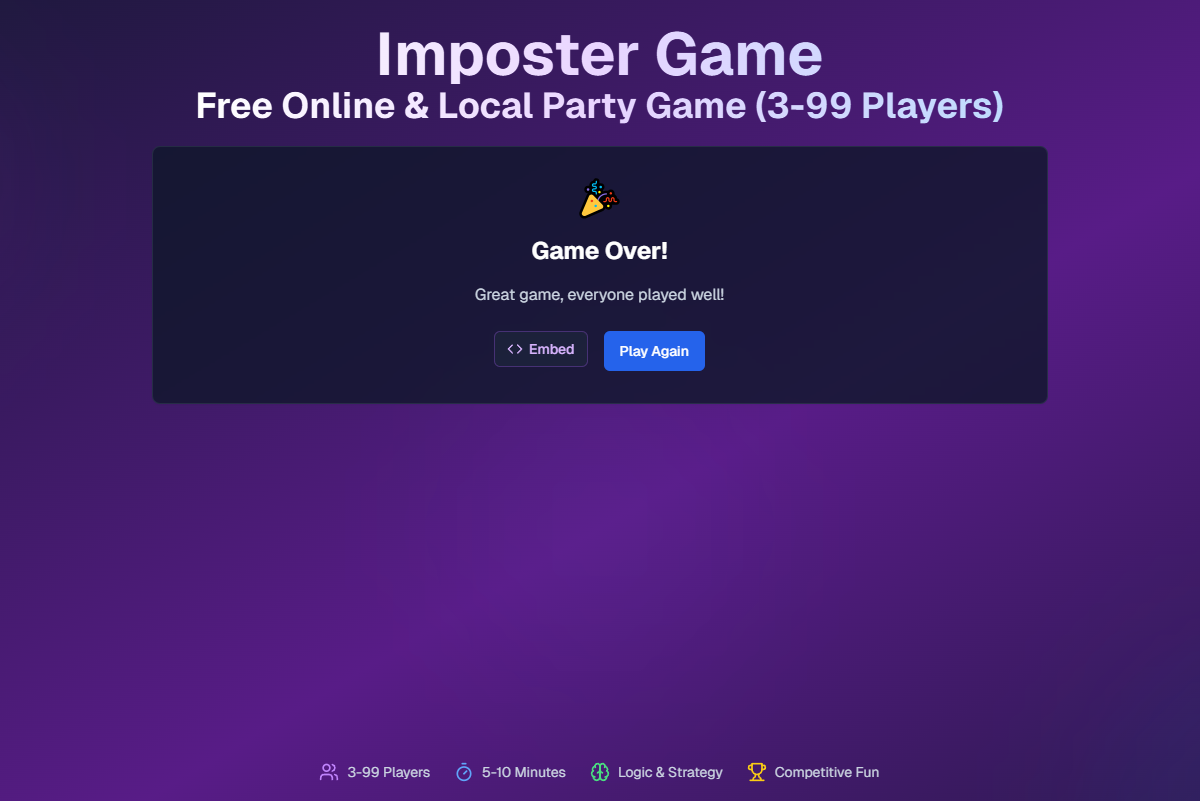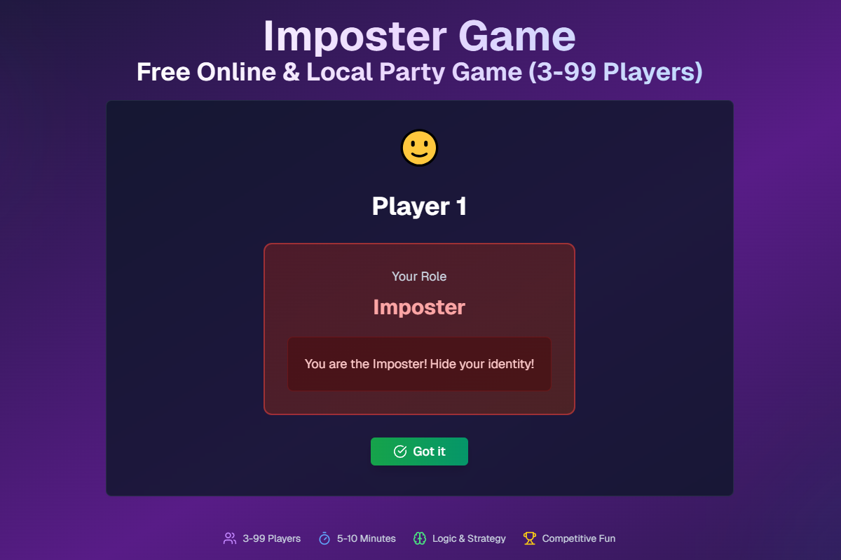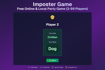 Imposter Game is an innovative online & local party game that blends classic social deduction with word-based deception. Perfect for friends, families, and streamers!